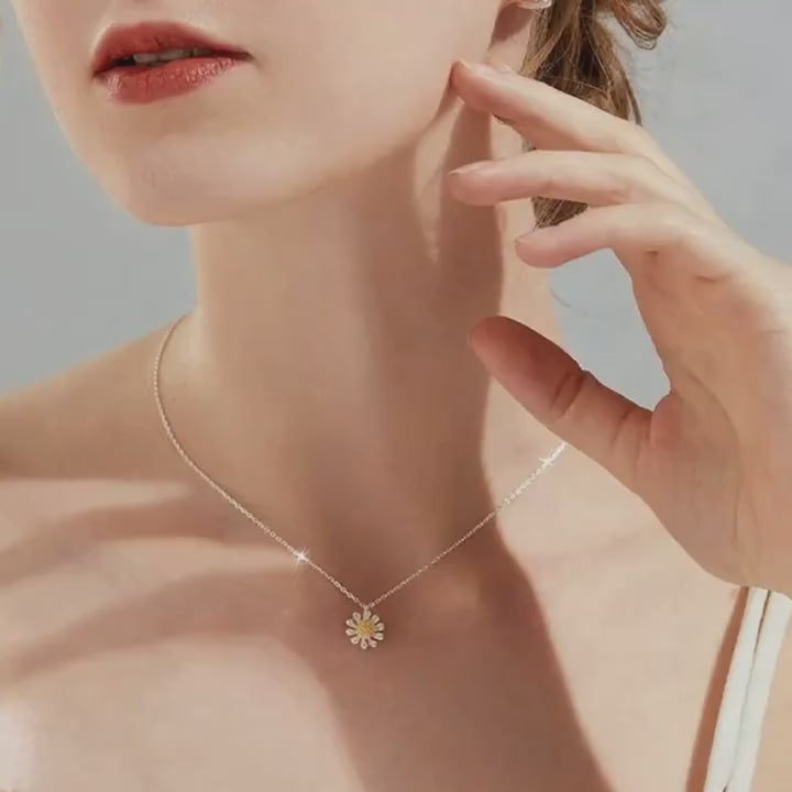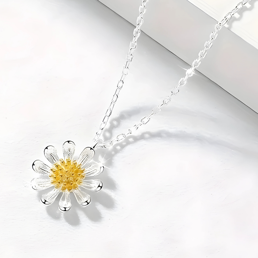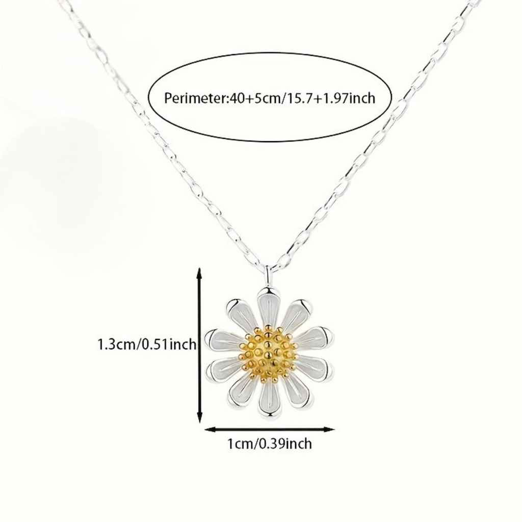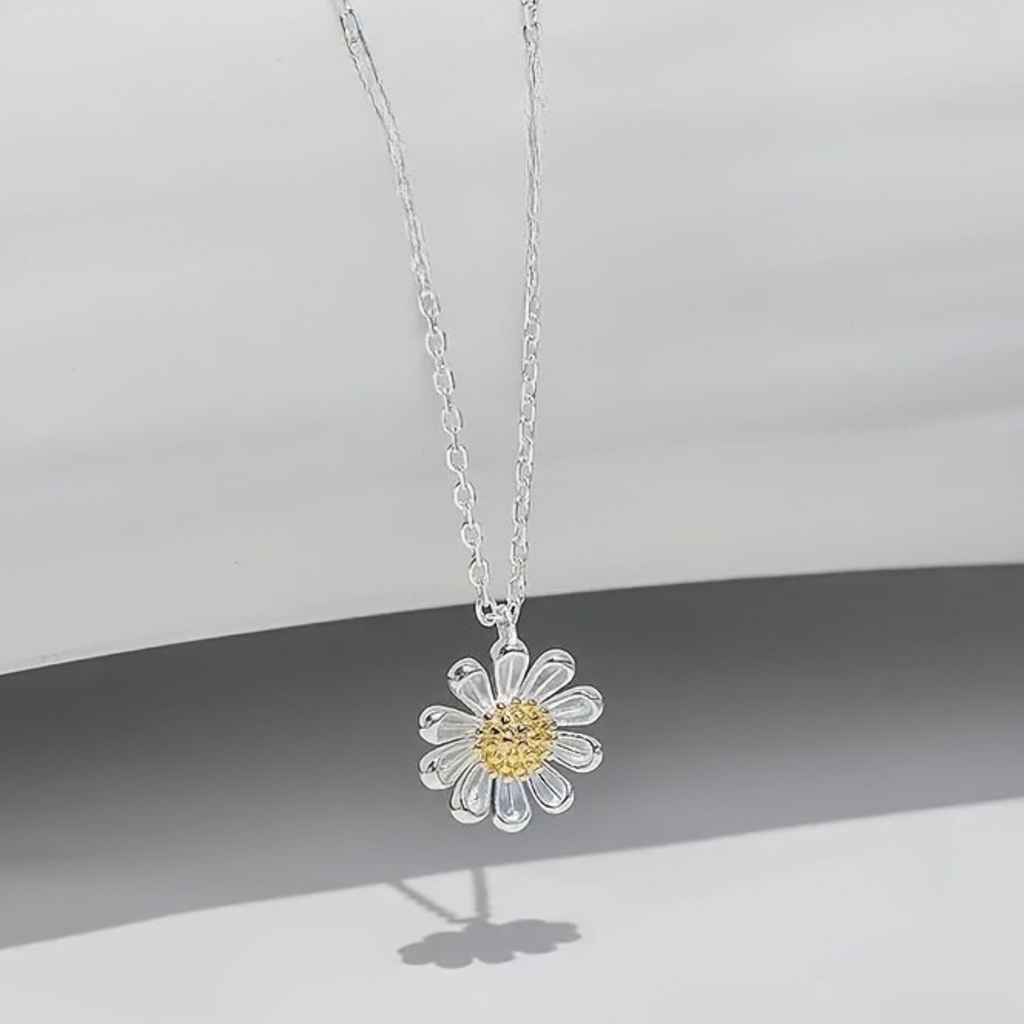 Este delicado collar está fabricado en plata 925 con un diseño inspirado en la pureza y la frescura de la naturaleza. Su dije en forma de margarita con centro dorado simboliza alegría, inocencia y un estilo minimalista perfecto para toda ocasión.