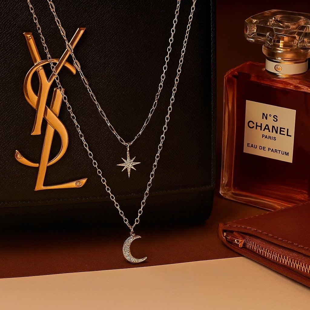 . Diseño: Cadena doble con colgantes de luna y estrella