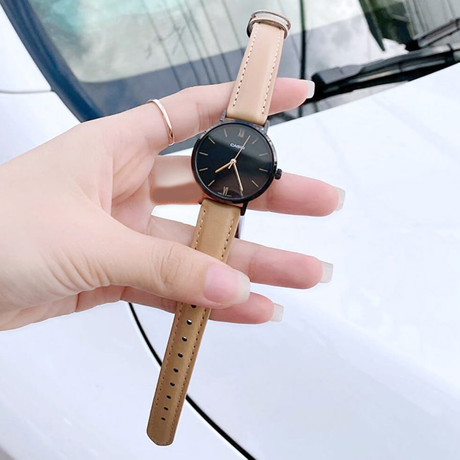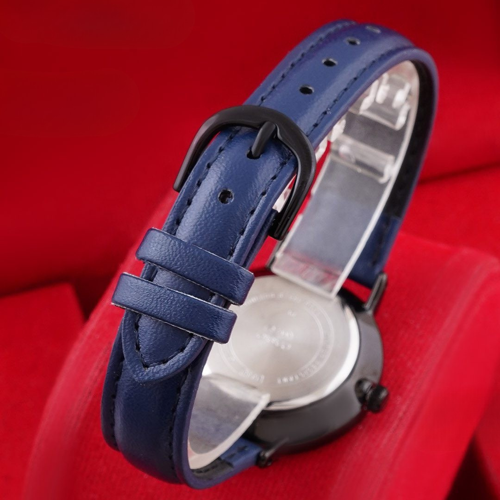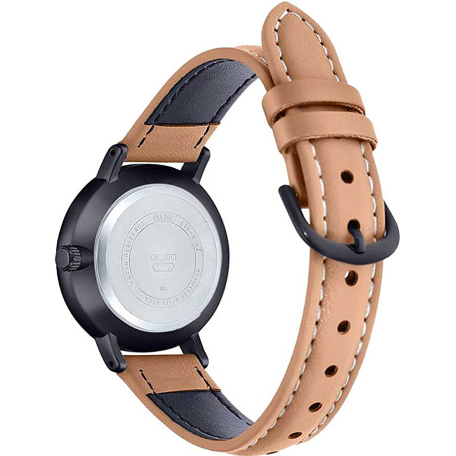 Un accesorio femenino con correa de cuero genuino, bisel negro tonalidad ion-plated, y dial negro con fechador. Con diseño compacto y ligereza extrema.