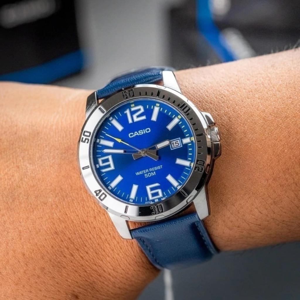 Casio MTP-VD01GL-1EVUDF, un reloj que une elegancia, resistencia y precisión japonesa. Su cajaa de acero inoxidable y su correa de cuero transmiten fuerza y sofisticación en cada detalle.